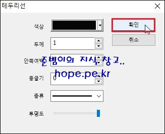 테두리선 창에서, 테두리선의 '색상, 두께, 안쪽여백, 둥글기, 종류, 투명도' 지정 후 '확인' 을 클릭 합니다.