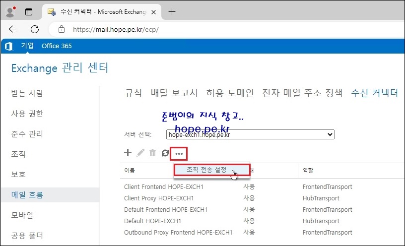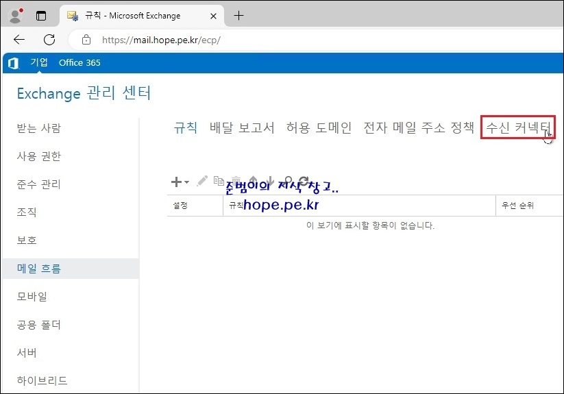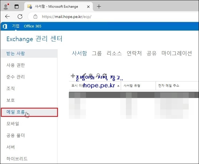 Exchange 관리 센터 접속 후 '메일 흐름' 을 클릭 합니다.