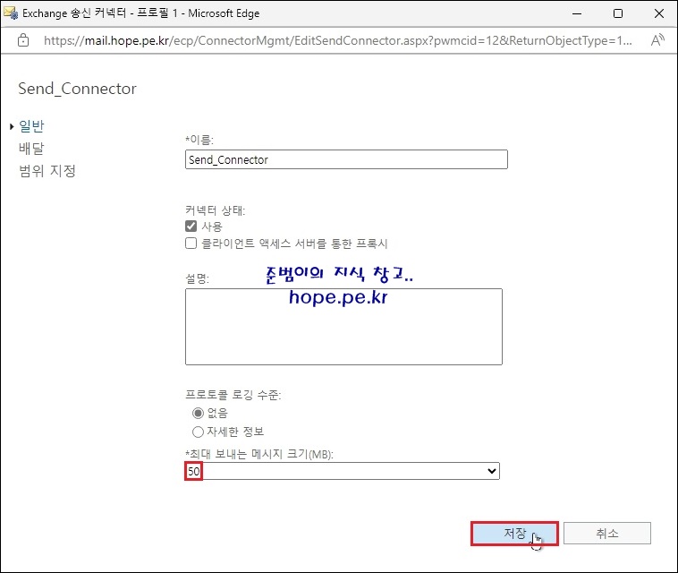 Exchange 송신 커넥터 설정 창에서, 송신 가능한 메일 크기를 확인할 수 있습니다.
