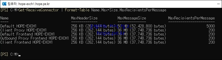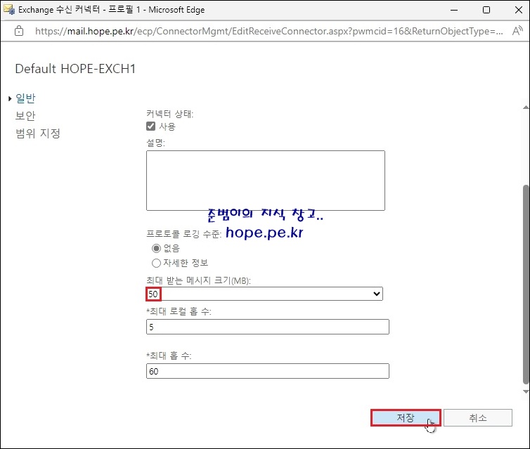Exchange 수신 커넥터 설정 창에서, 수신 가능한 메일 크기를 확인할 수 있습니다.
