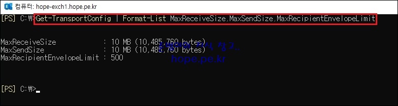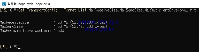 Get-TransportConfig | Format-List MaxReceiveSize,MaxSendSize,MaxRecipientEnvelopeLimit