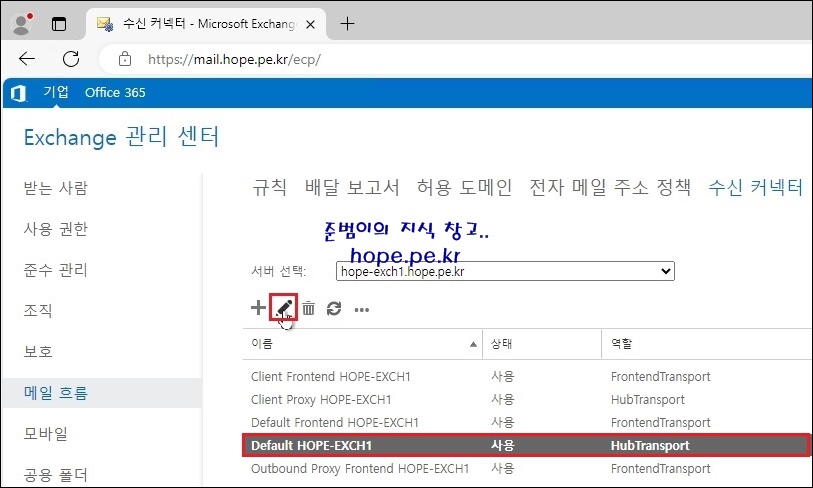 기본 수신 커넥터(Default ExchangeHostname) 클릭 후 '편집' 을 클릭 합니다.