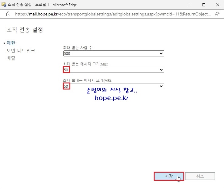 받는 메일 크기 및 보내는 메일 크기를 원하는 크기로 변경 후 '저장' 을 클릭 합니다.