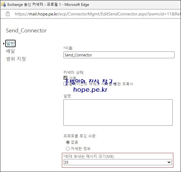 Exchange 송신 커넥터 설정 창에서, 송신 가능한 메일 크기를 확인할 수 있습니다.