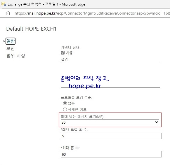 Exchange 수신 커넥터 설정 창에서, 수신 가능한 메일 크기를 확인할 수 있습니다.