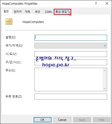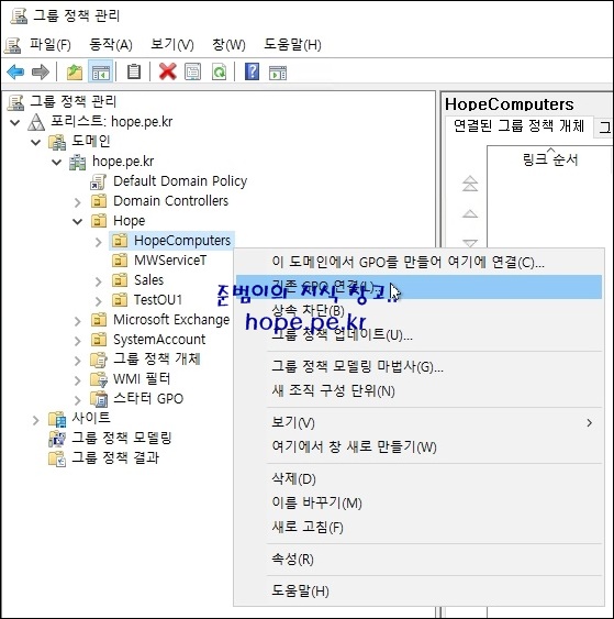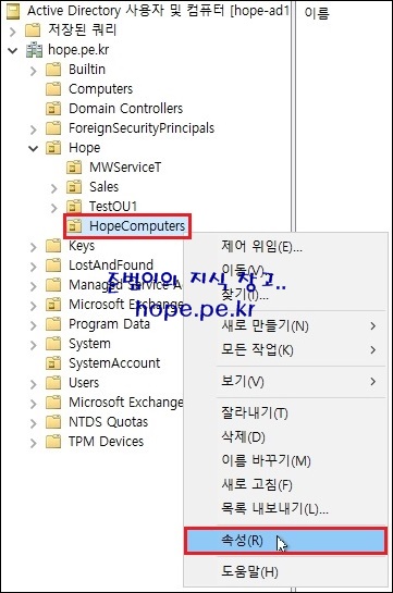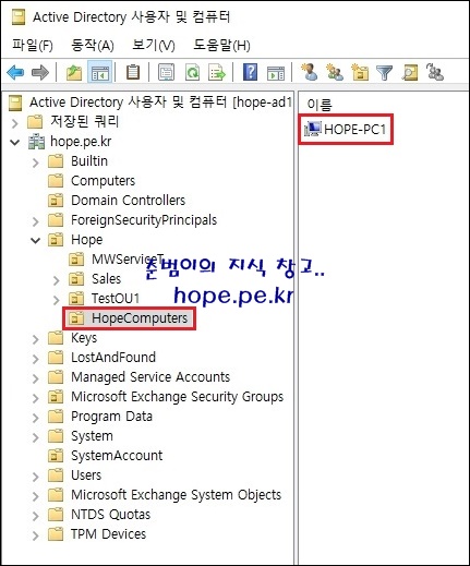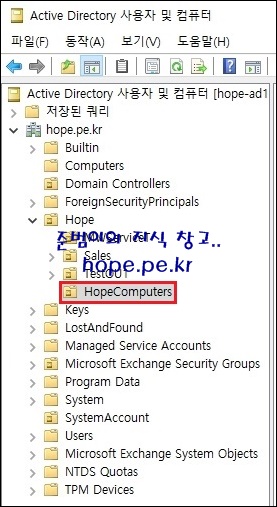 먼저 도메인 가입 컴퓨터 개체가 자동으로 저장되는 OU를 생성 합니다. 저는 'HopeComputers' 라는 OU를 특정 경로에 생성했습니다.