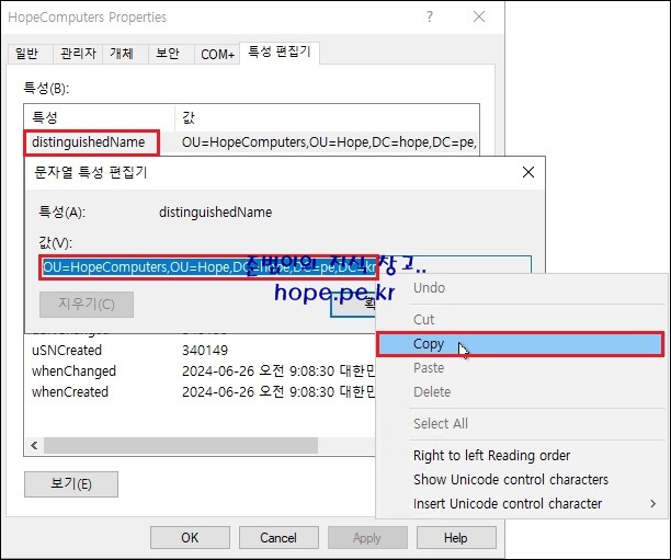 'distinguishedName' 속성의 '값' 을 복사 합니다.