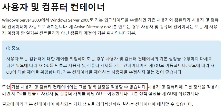 cf) 기본 사용자 및 컴퓨터 컨테이너는 그룹 정책 설정을 적용할 수 없습니다.