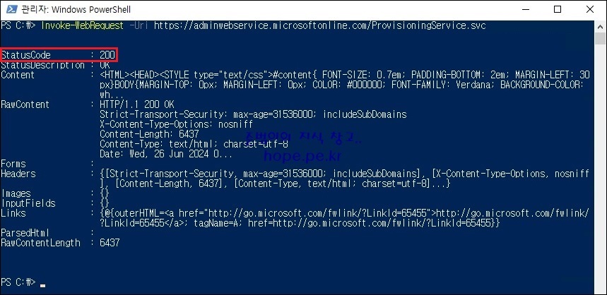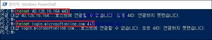 PowerShell에서 다음 명령어를 실행하여, Microsoft Entra Connect 서버가 웹 요청을 허용하는지 확인합니다.