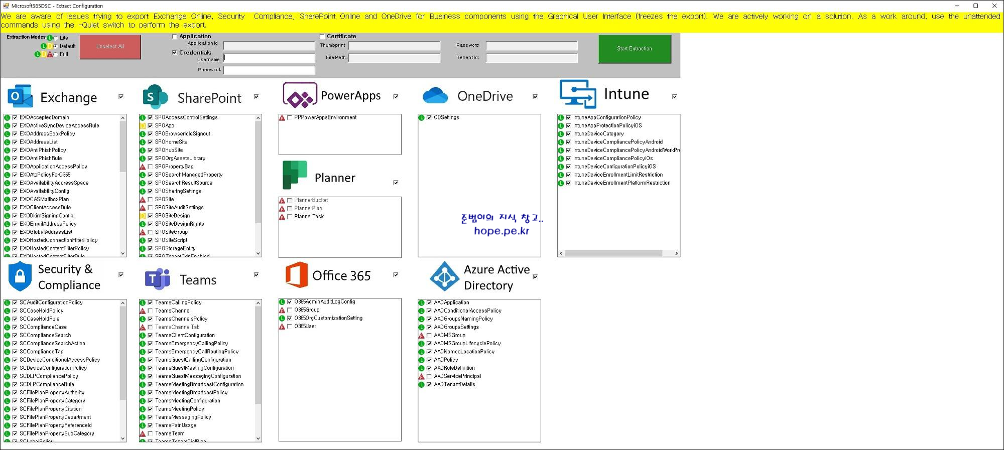 Extraction Modes 의 Lite / Default / Full 라디오 버튼으로 기본 제공하는 옵션을 선택하거나 원하는 Microsoft 365 서비스 영역의 특정 기능들만을 선택할 수도 있습니다.