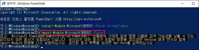 'Import-Module Microsoft365DSC -Force' 명령어를 실행 합니다.