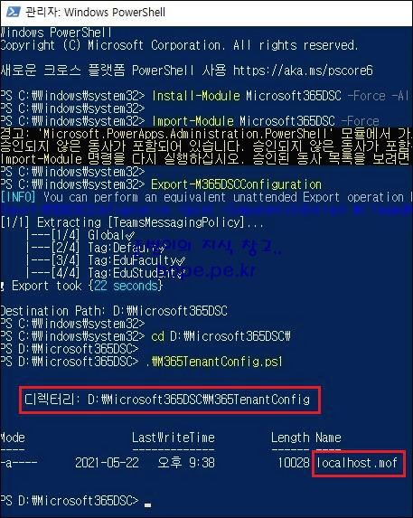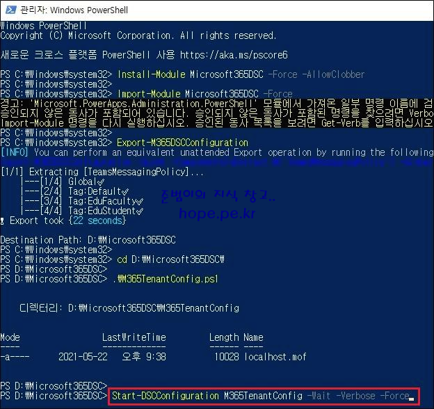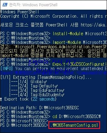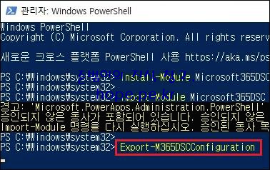 'Export-M365DSCConfiguration' 명령어를 실행 합니다.