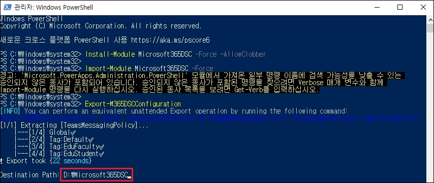 설정을 내보내기 할 경로를 입력 합니다. 저는 'D:\Microsoft365DSC' 경로를 사용 했습니다.