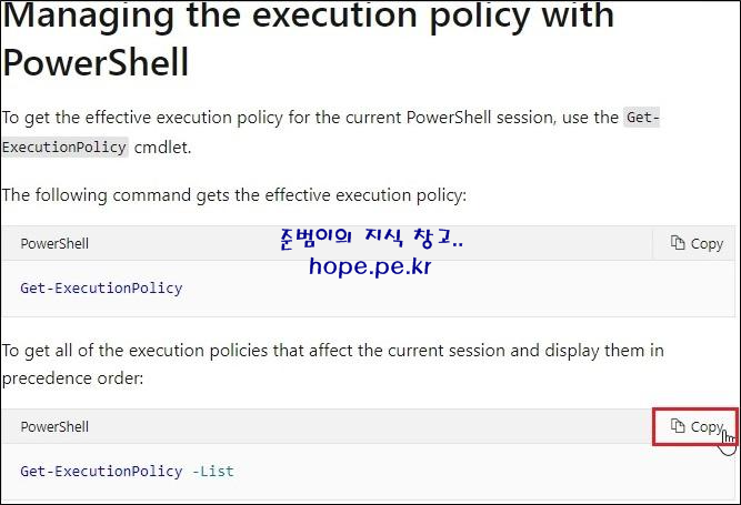 Microsoft Docs 'About Execution Policies' 사이트 중간 부분 'Managing the execution policy with PowerShell' 단락의 'Get-ExeutionPolicy -List' 명령어를 'Copy' 를 클릭하여 복사 합니다.