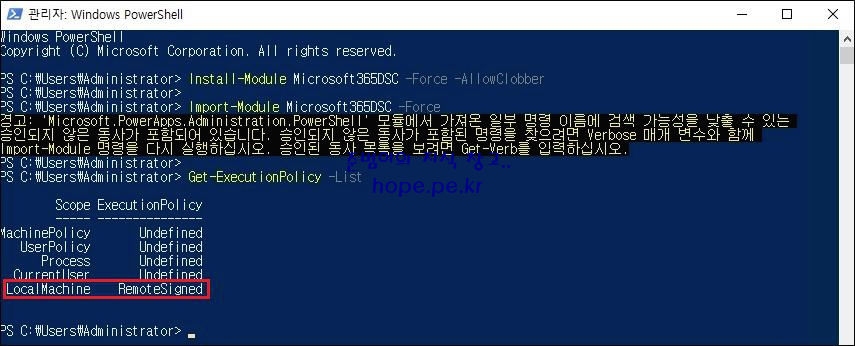 다시 'Get-ExeutionPolicy -List' 명령어 실행 후 결과값을 확인 합니다. 'LocalMachine' Scope의 ExecutionPolicy가 'RemoteSigned' 잘 변경되었습니다.