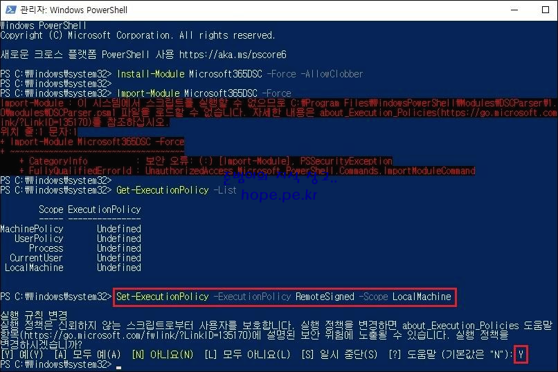 'Set-ExeutionPolicy -ExecutionPolicy RemoteSigned -Scope LocalMachine' 명령어를 실행 합니다. '실행 정책을 변경하시겠습니까?' 메세지에서, 'Y' 입력 후 실행 합니다.