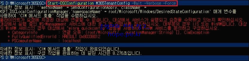 다시 'Start-DSCConfiguration M365TenantConfig -Wait -Verbose -Force' 명령어를 실행 합니다.