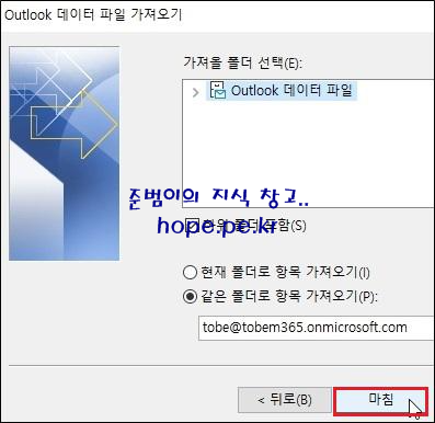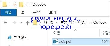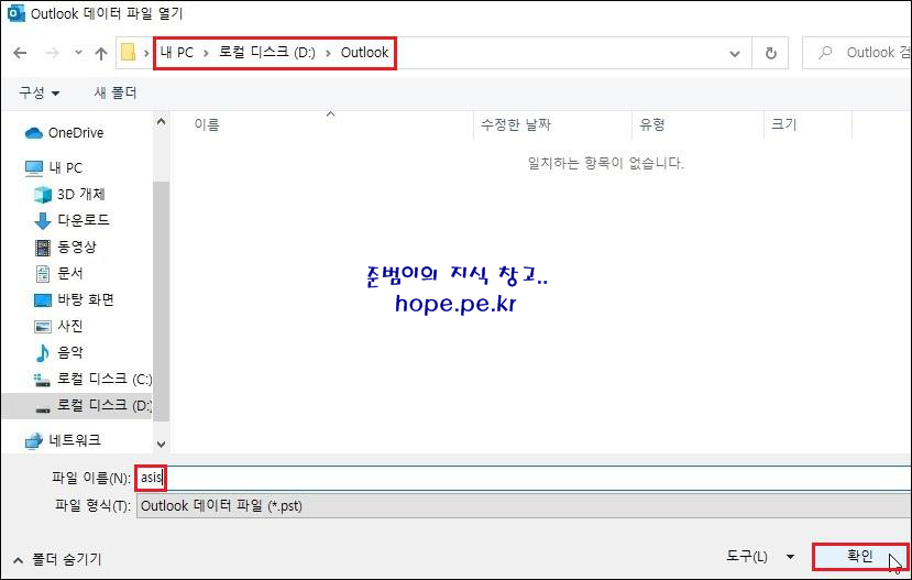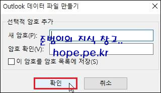 Outlook 데이터 파일 만들기 창에서, '확인' 을 클릭 합니다.