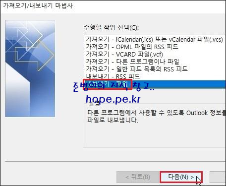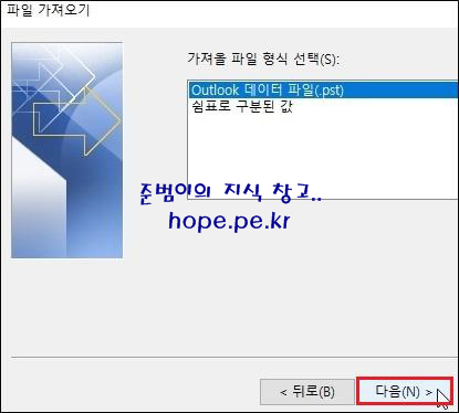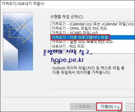 가져오기/내보내기 마법사 창에서, '가져오기 - 다른 프로그램이나 파일' 클릭 후 '다음' 을 클릭 합니다.