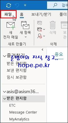 ASIS 테넌트 계정에서 Outlook 을 실행 합니다. 그리고 '파일' 을 클릭 합니다.