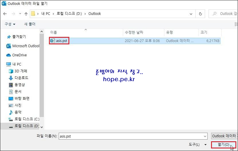Outlook 데이터 파일 열기 창에서, '내보내기 한 PST 파일' 선택 후 '열기' 를 클릭 합니다.
