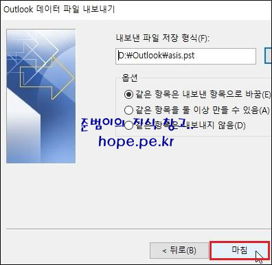 Outlook 데이터 파일 열기 창에서, 'Outlook 데이터 파일을 내보낼 경로' 및 '파일 이름' 지정 후 '확인' 을 클릭 합니다.