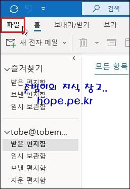 TOBE 테넌트 계정에서 Outlook 을 실행 합니다. 그리고 '파일' 을 클릭 합니다.