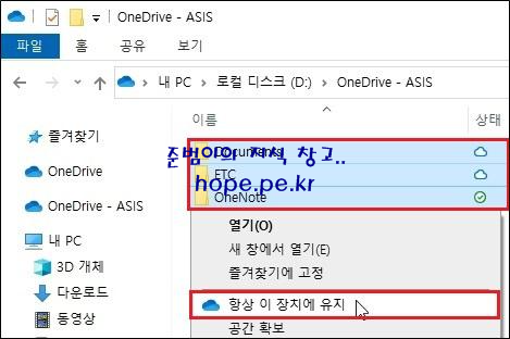 OneDrive 동기화 폴더의 모든 파일들을 PC에 저장하기 위해 '모든 폴더 및 파일' 선택 후 우클릭 하여 '항상 이 장치에 유지' 를 클릭 합니다.