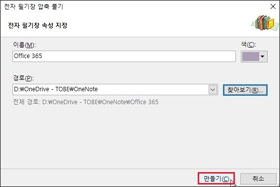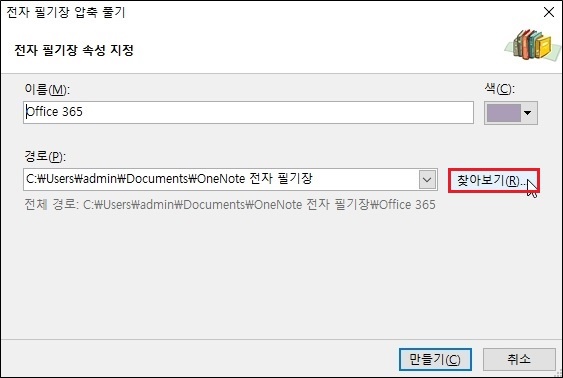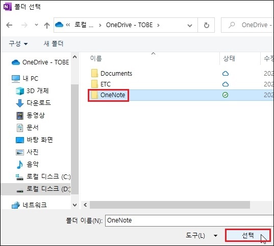 향후 OneNote 파일을 관리하기 위한 적절한 폴더 이름 지정 후 '선택' 을 클릭 합니다.
