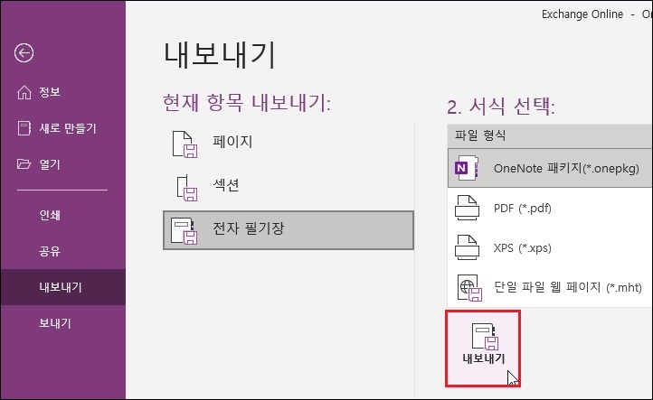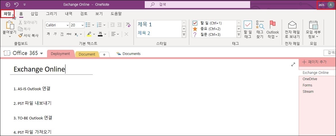 먼저 ASIS 테넌트 계정에서 OneNote 전자 필기장을 내보내기 합니다.
