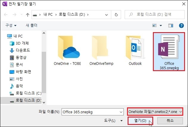 파일 형식을 'OneNote 파일(*.onetoc2,*.one)' 로 변경 후 'OneNote 단일 파일 패키지 파일' 선택 후 '열기' 를 클릭 합니다.