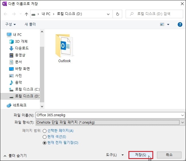 다른 이름으로 저장 창에서, 내보낼 OneNote 단일 파일 패키지 '파일의 위치 및 파일 이름' 지정 후 '저장' 을 클릭 합니다.