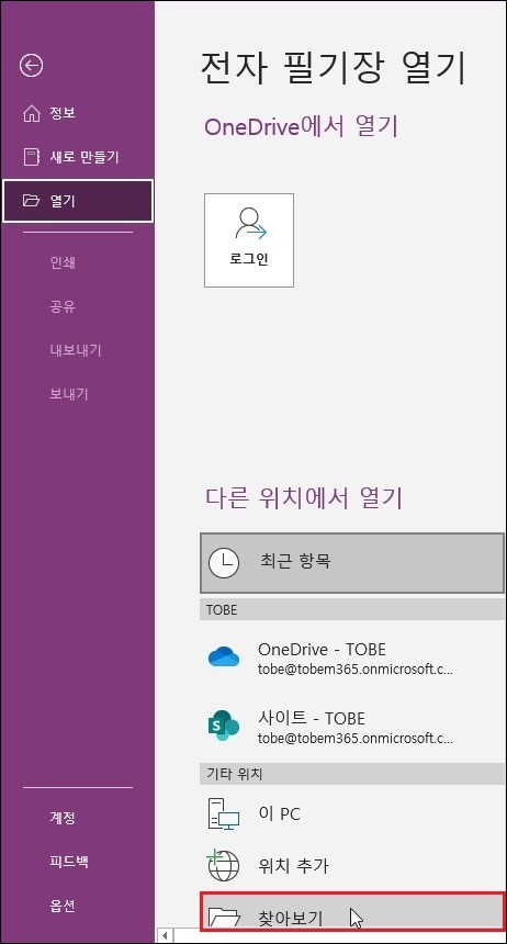 전자 필기장 열기 화면에서, '기타 위치 > 찾아보기' 를 클릭 합니다.