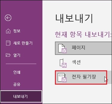 내보내기 화면에서, '전자 필기장' 을 클릭 합니다.