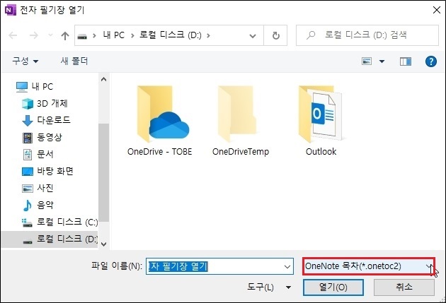전자 필기장 열기 창에서, 'OneNote 목차(*.onetoc2)' 를 클릭 합니다.
