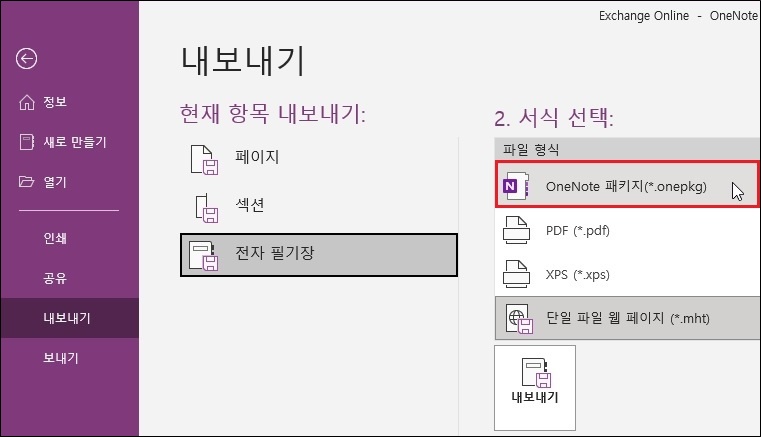 2. 서식 선택 에서, 'OneNote 패키지(*.onepkg)' 를 클릭 합니다.