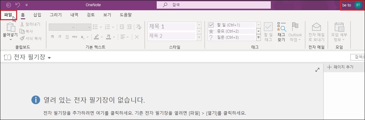 TOBE 테넌트 계정으로 로그인한 OneNote 앱에서, '파일' 을 클릭 합니다.