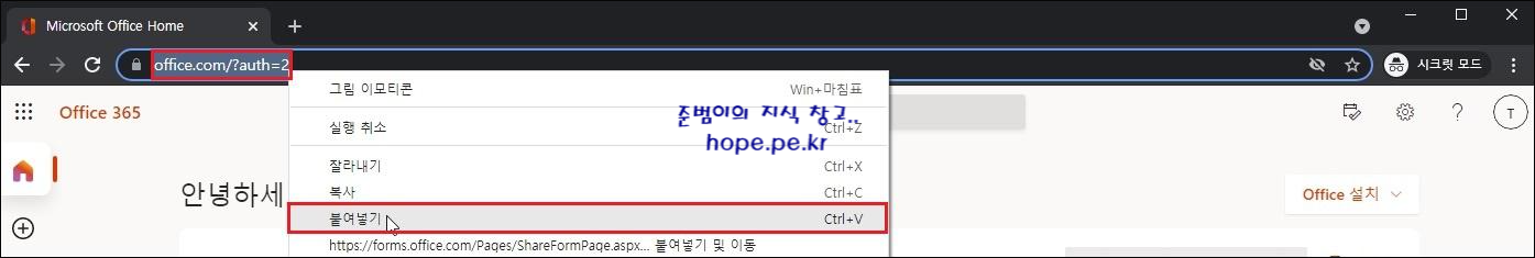 TOBE 테넌트 계정으로 브라우저에서 office.com 사이트에 접속후, '주소표시줄' 에 복사한 URL 을 '붙여넣기' 합니다.