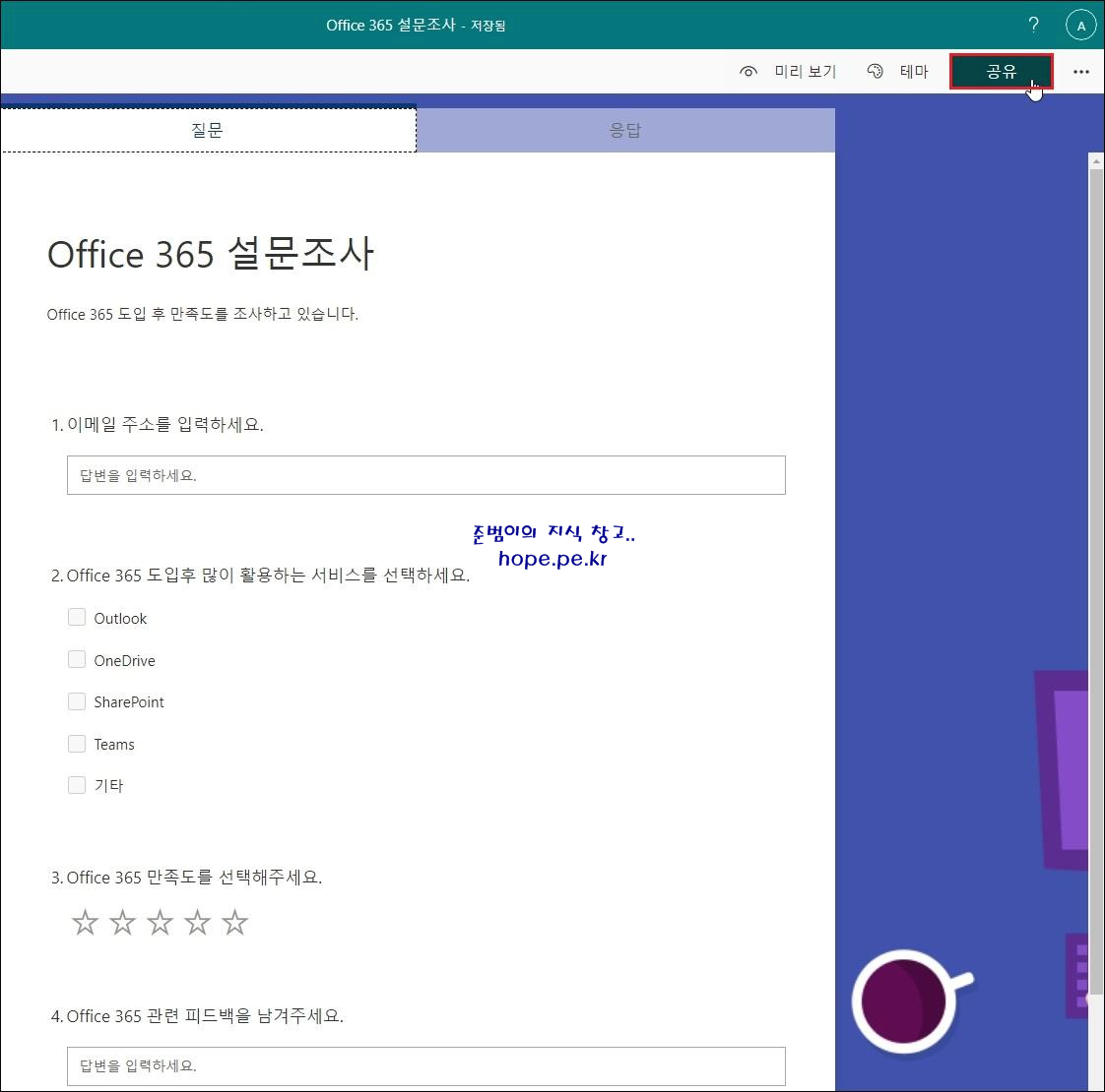 템플릿에서, 우측 상단의 '공유' 를 클릭 합니다.