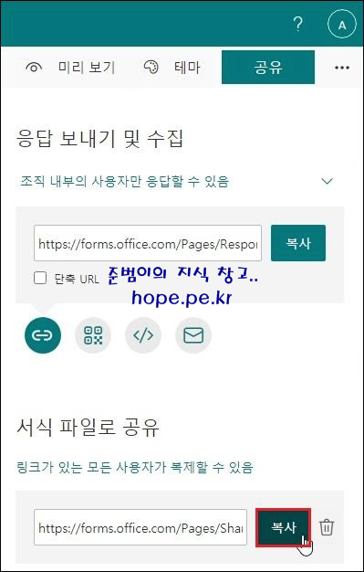 서식 파일로 공유 메뉴에서, '복사' 를 클릭 합니다.