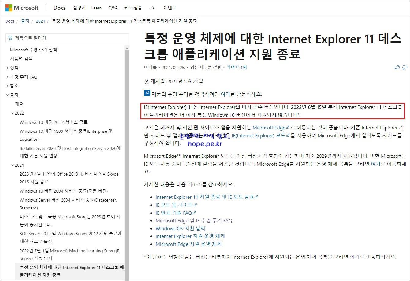 Microsoft에서 Internet Explorer 11에 대한 지원 종료를 2022년06월15일로 공식 발표 하였습니다.