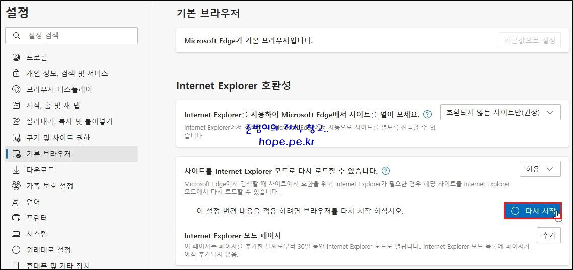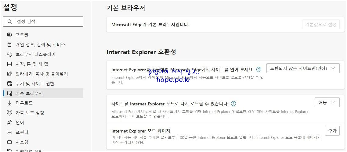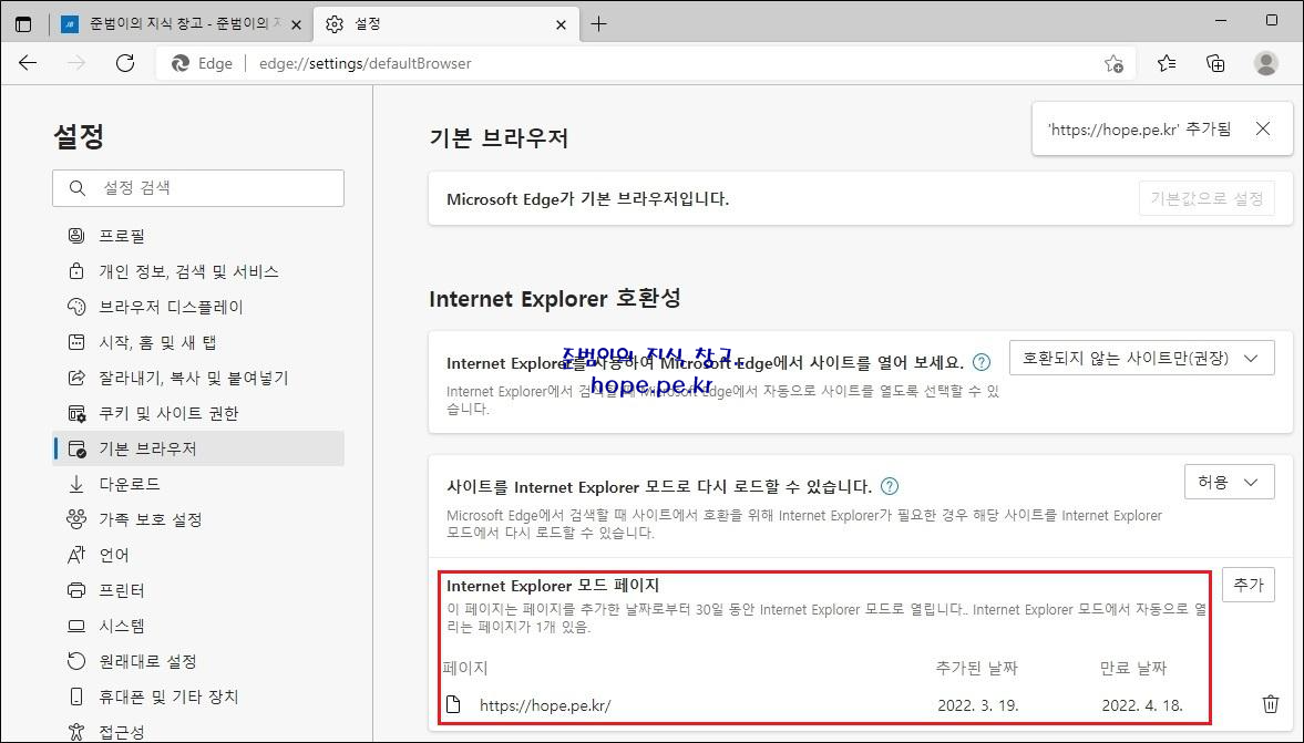 참고로 '설정 > 기본 브라우저' 화면에서 'Internet Explorer 모드 페이지' 에 해당 사이트가 등록 되었음을 확인할 수 있습니다.