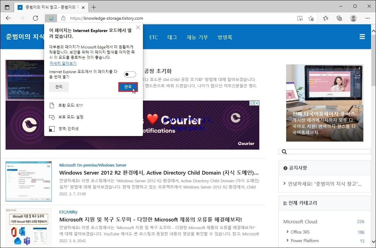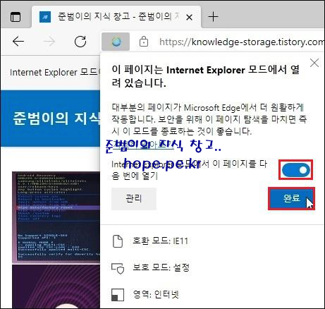 그럼 정상적으로 잘 표시가 되면서, 아래이 '이 페이지는 Internet Explorer 모드에서 열려 있습니다.' 메세지가 발생합니다. '완료' 를 클릭 합니다.