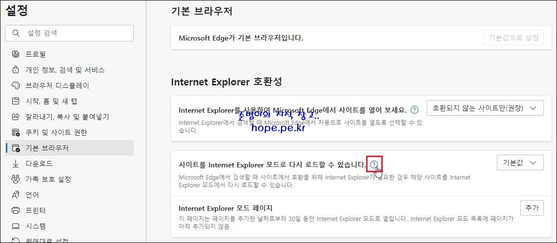 기본 브라우저 화면에서, '사이트를 Internet Explorer 모드로 다시 로드할 수 있습니다.' 우측의 '물음표' 를 클릭 합니다.