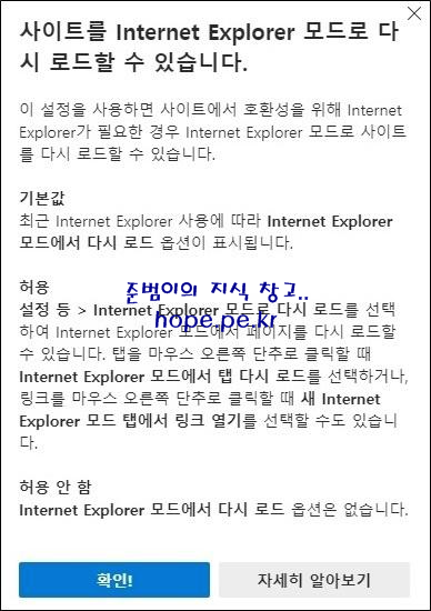 그럼 Internet Explorer 모드 사용에 대한 자세한 설명이 나옵니다. 참고 부탁드립니다.
