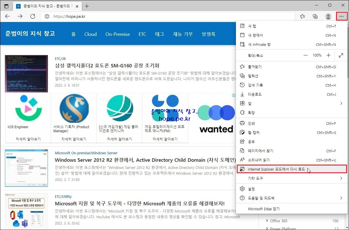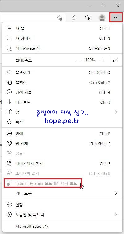 '··· (설정 및 기타)' 버튼을 클릭해보면 'Internet Explorer 모드에서 다시 로드' 메뉴가 새롭게 보입니다.