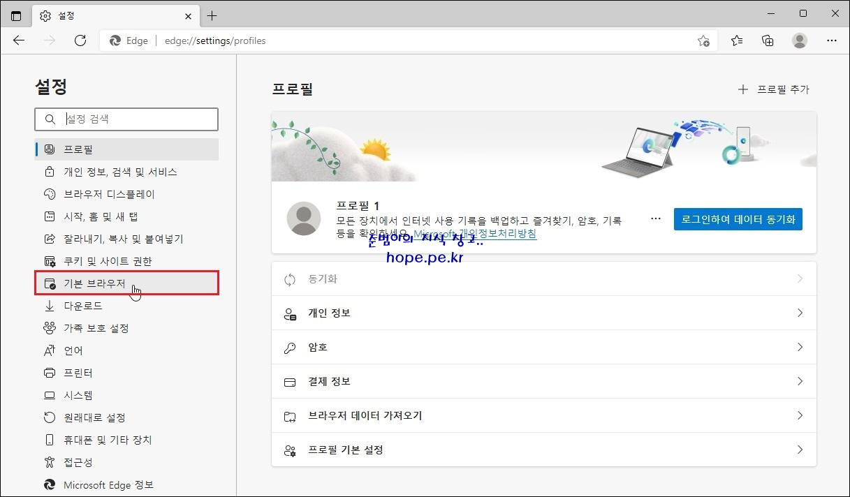 설정 페이지에서, '기본 브라우저' 를 클릭 합니다.