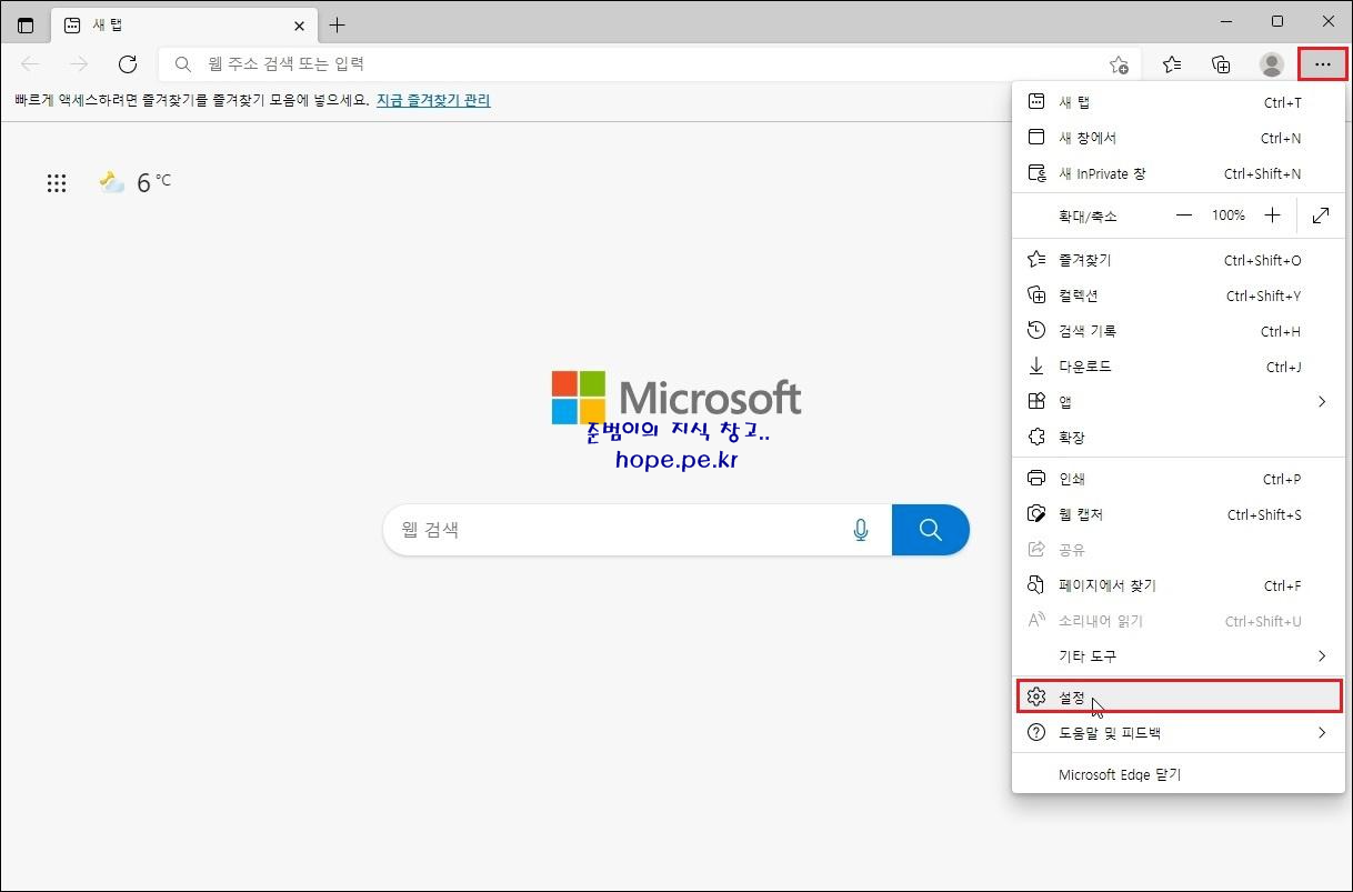 먼저 Edge 브라우저에서, '··· (설정 및 기타)' 클릭후 '설정' 을 클릭 합니다.