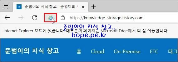 다시 한번 Internet Explorer 모드를 사용한다는 메세지인 'Internet Explorer 모드에 있습니다. 대부분의 페이지는 Microsoft Edge에서 더 잘 작동합니다.' 가 표시 됩니다.