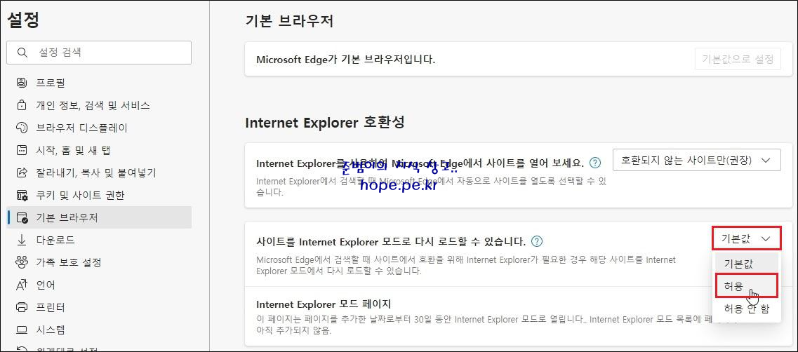 '사이트를 Internet Explorer 모드로 다시 로드할 수 있습니다.' 의 '기본값' 클릭후 '허용' 을 클릭 합니다.